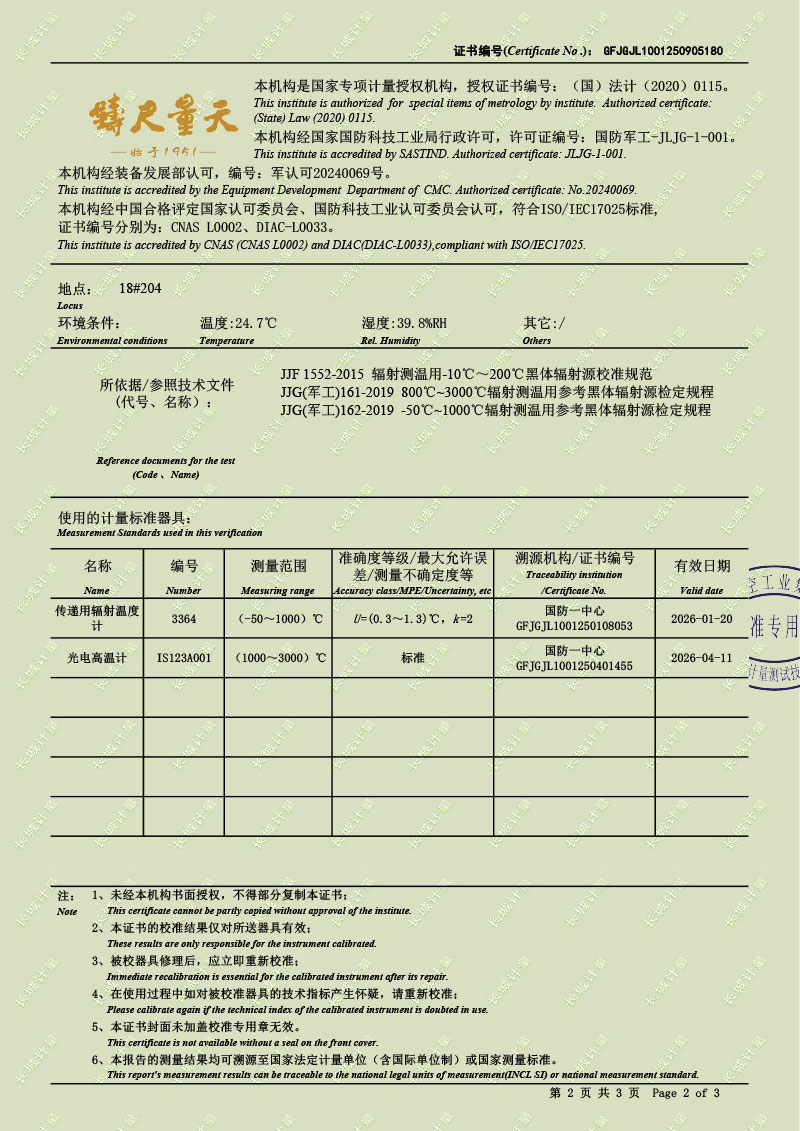 黑體輻射源(50-1200℃)校準(zhǔn)證書 2025-9-22 本文被閱讀 1590 次