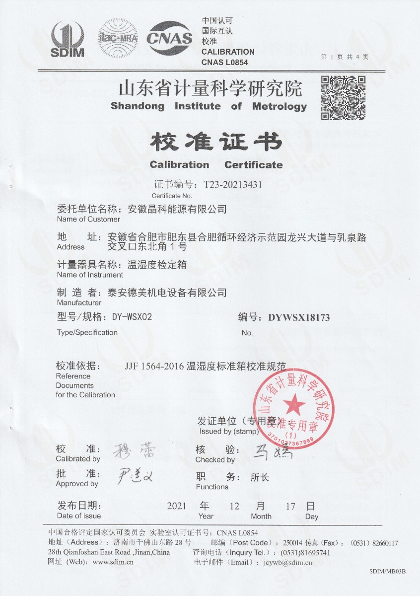 安徽晶科能源有限公司-溫濕度檢定箱 2021-12-30 本文被閱讀 15135 次