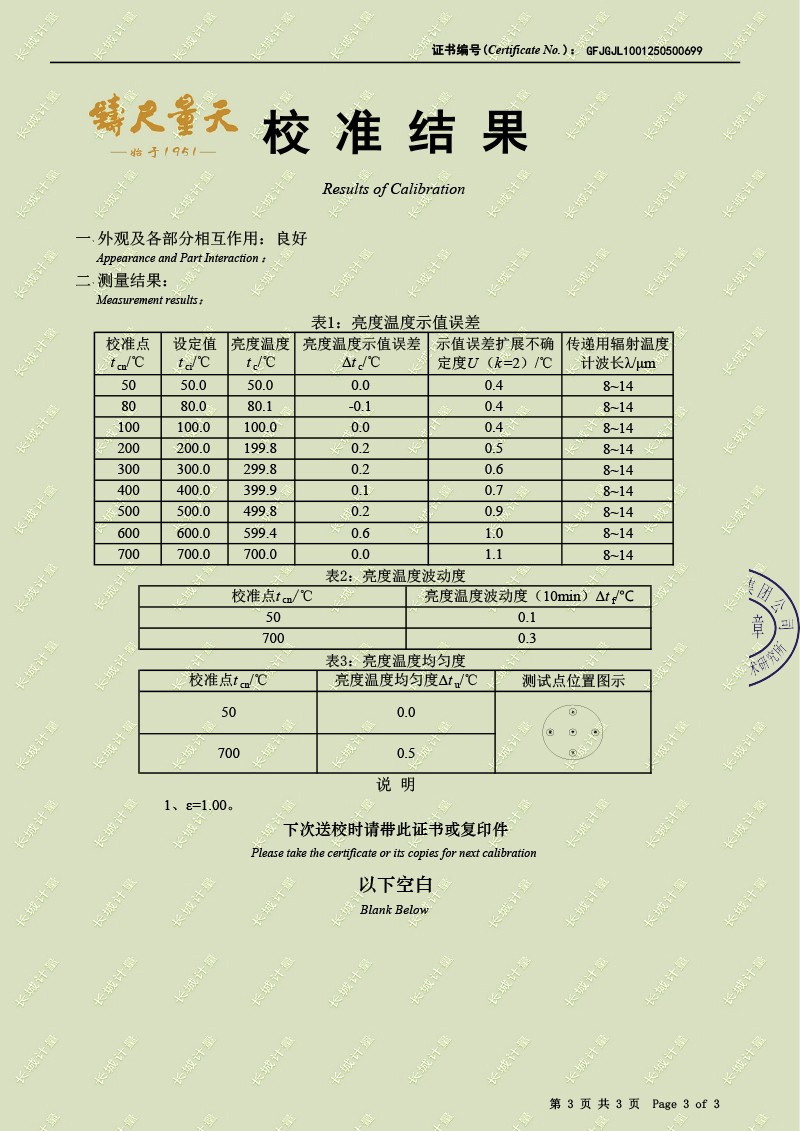 腔式黑體輻射源(50-700℃)校準(zhǔn)證書 2025-5-9 本文被閱讀 3213 次