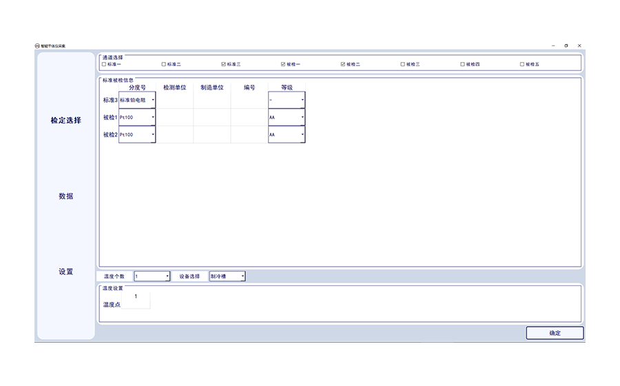 1.可實現(xiàn)設(shè)備的8通道的任意檢定選擇,可選擇通道的分度號類型,及被測傳感器的檢測單位、制造單位,傳感器編號及等級