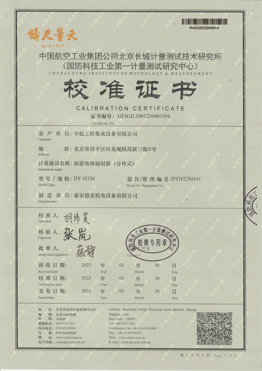 中航工程集成設備有限公司 面源黑體輻射源(分體式) 校準證書 2023-5-4 本文被閱讀 13568 次