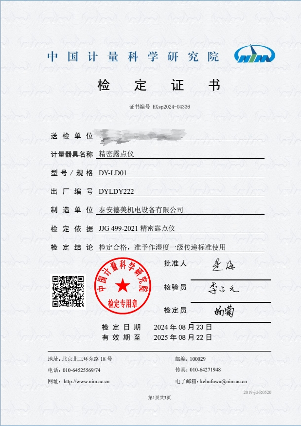 露點儀檢定證書 2024-9-3 本文被閱讀 6553 次