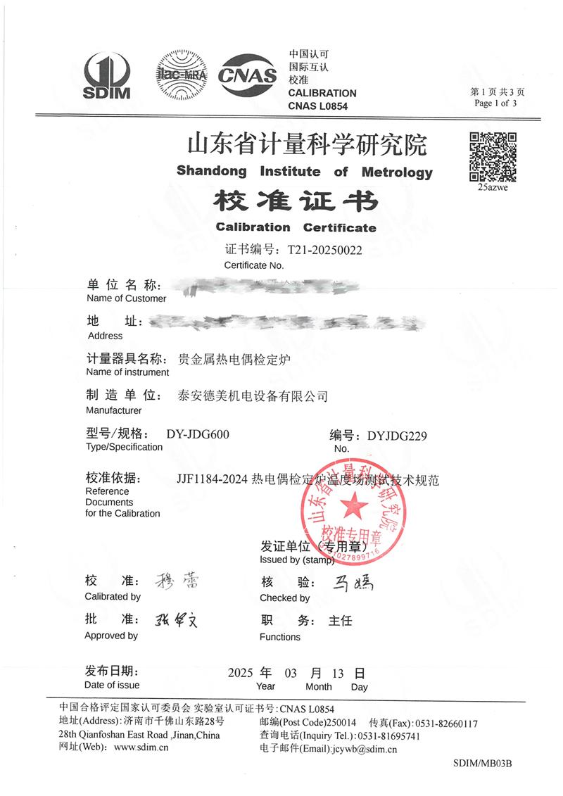 貴金屬熱電偶檢定爐(300-1200℃)校準證書 2025-3-15 本文被閱讀 3666 次