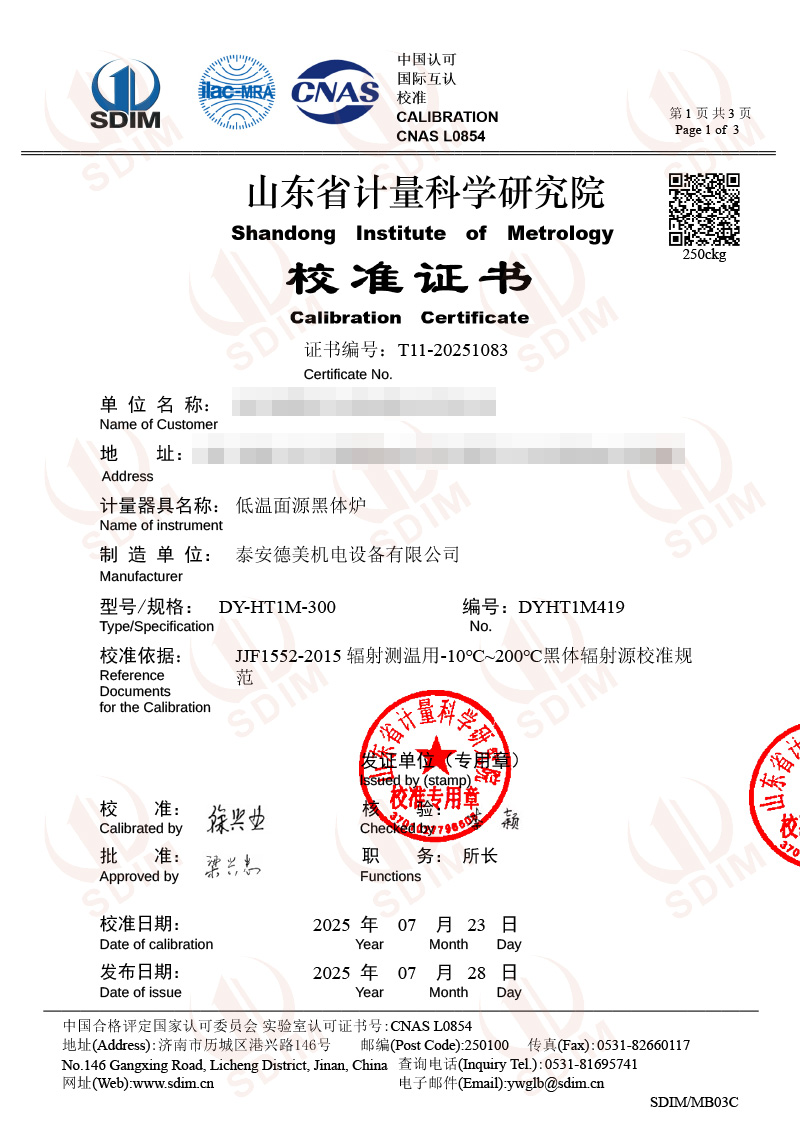 低溫面源黑體爐(0-60℃)校準(zhǔn)證書 2025-7-28 本文被閱讀 2813 次