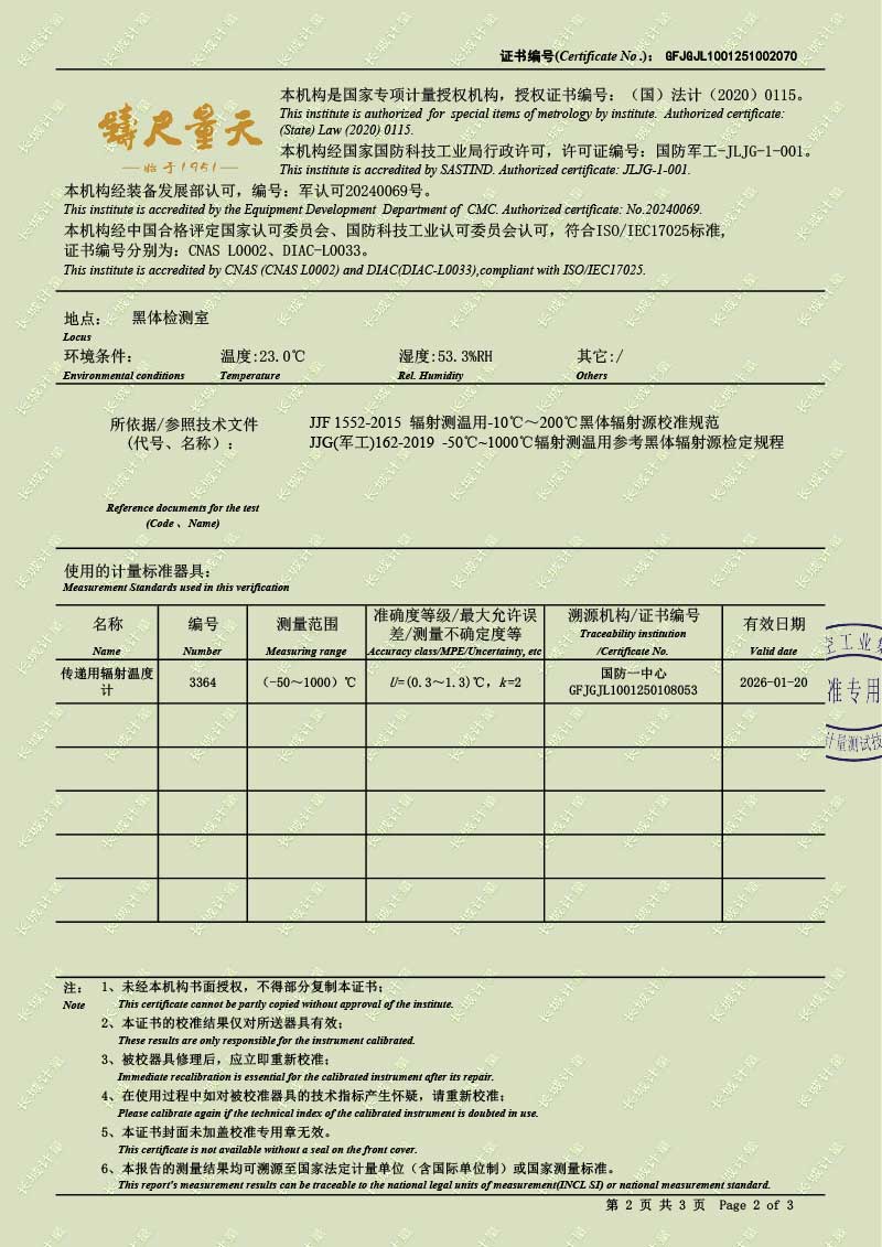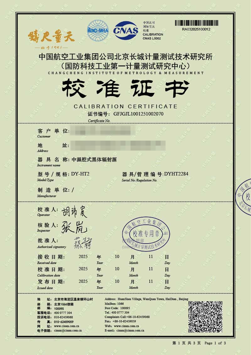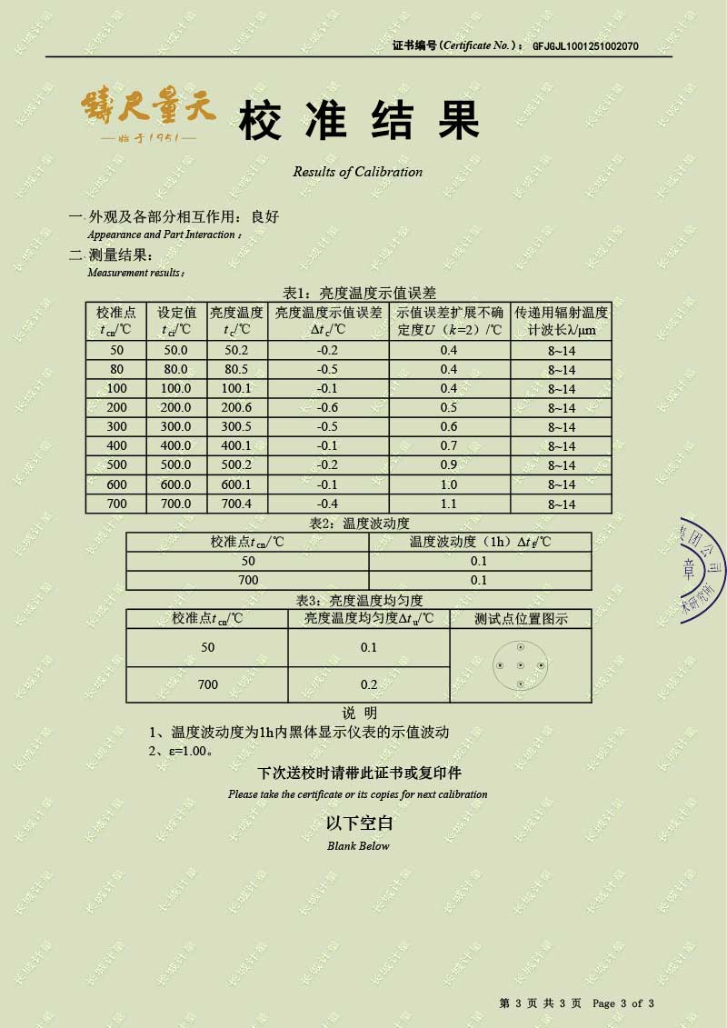 | 上一條:高溫腔式黑體輻射源(700-1600℃)校準(zhǔn)證書 | 下一條:高精度制冷恒溫槽(-80~100℃)校準(zhǔn)證書 |