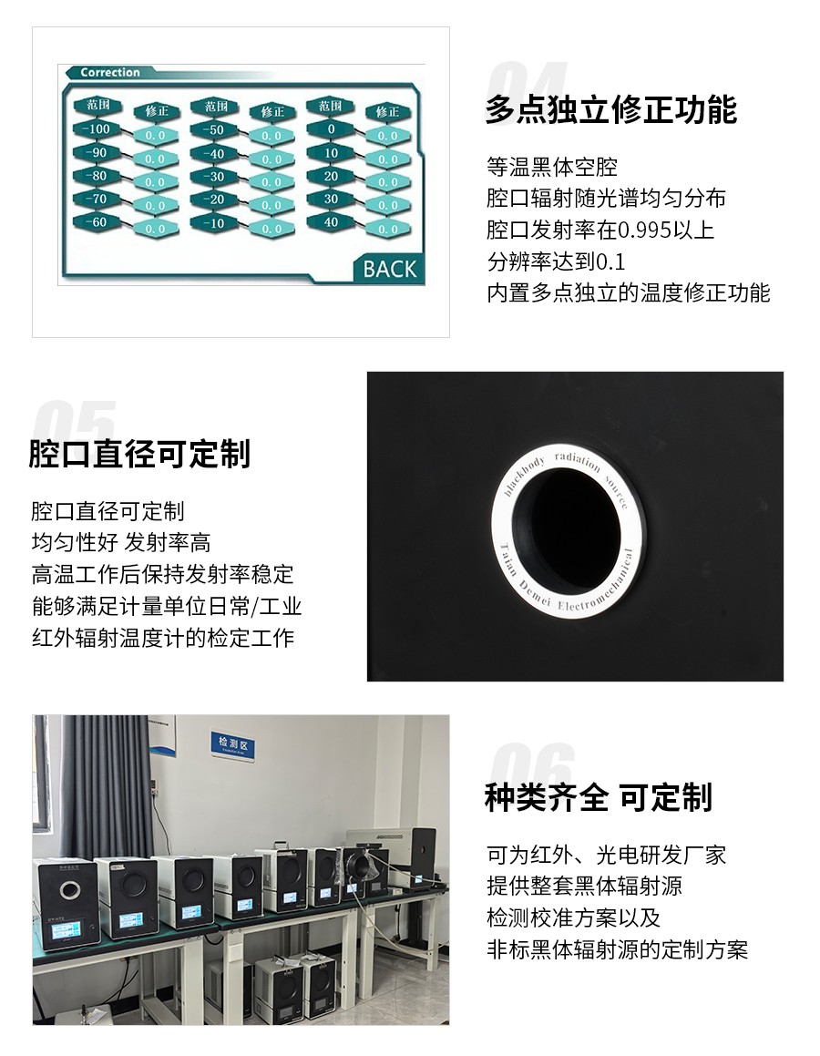 標(biāo)準(zhǔn)黑體作為標(biāo)準(zhǔn)輻射源,主要用于校準(zhǔn)輻射溫度計(jì)、紅外溫度計(jì)和輻射溫度傳感探測器。我公司目前具有先進(jìn)的黑體技術(shù),產(chǎn)品種類全、溫度范圍寬的黑體系列產(chǎn)品。產(chǎn)品體積小、重量輕、便于攜帶,不僅適合各級計(jì)量機(jī)構(gòu)實(shí)驗(yàn)室校準(zhǔn)輻射溫度計(jì)使用,同時(shí)可以用于現(xiàn)場校準(zhǔn)。