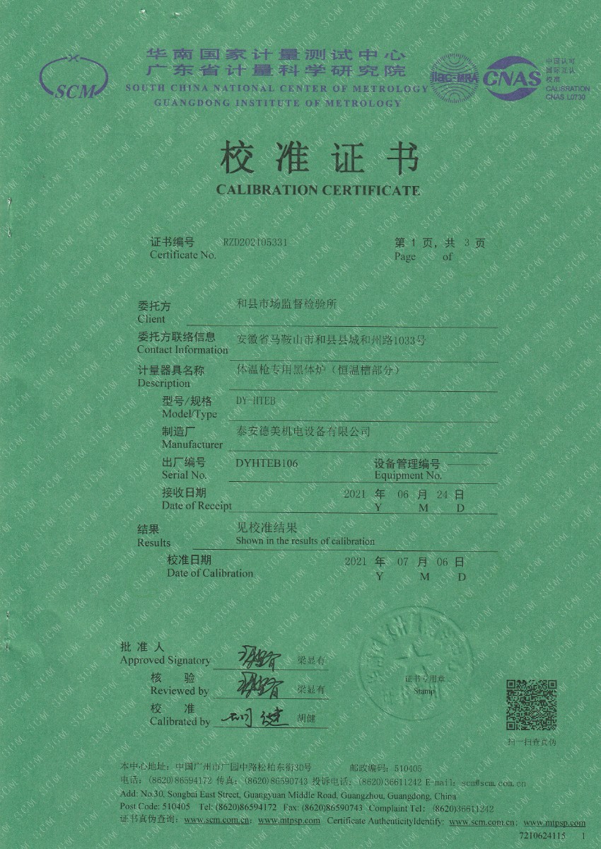| 上一條:和縣市場監(jiān)督檢驗(yàn)所-耳溫黑體(黑體輻射源) | 下一條:高精度制冷恒溫槽(-80~100℃)校準(zhǔn)證書 |