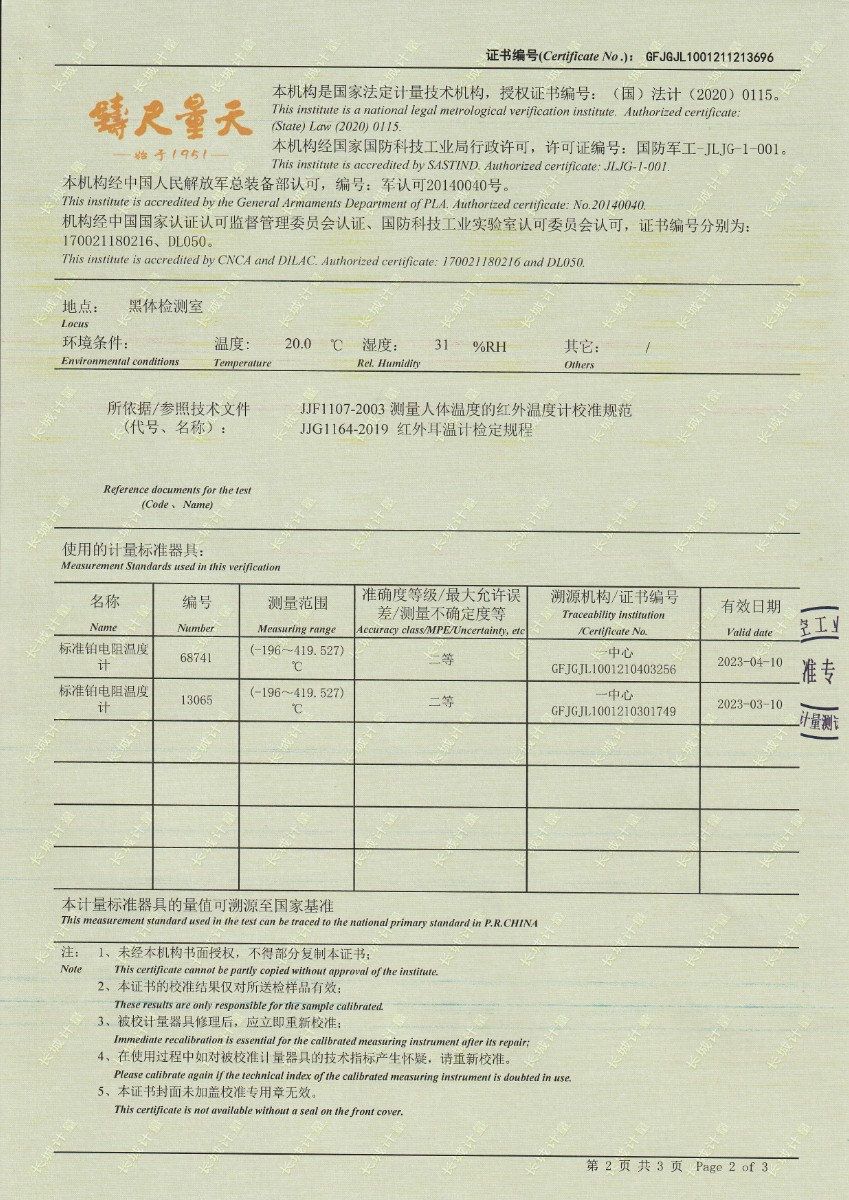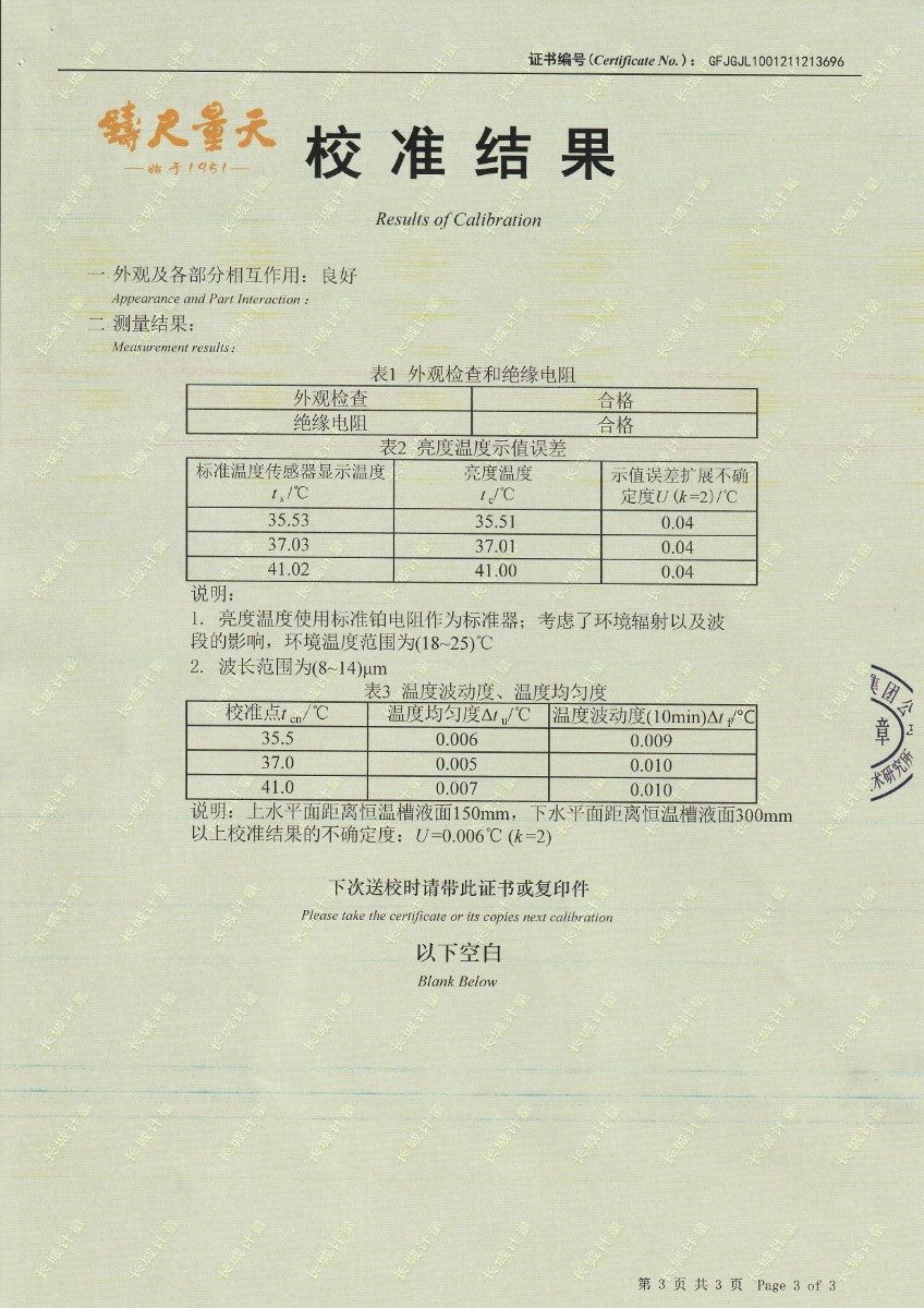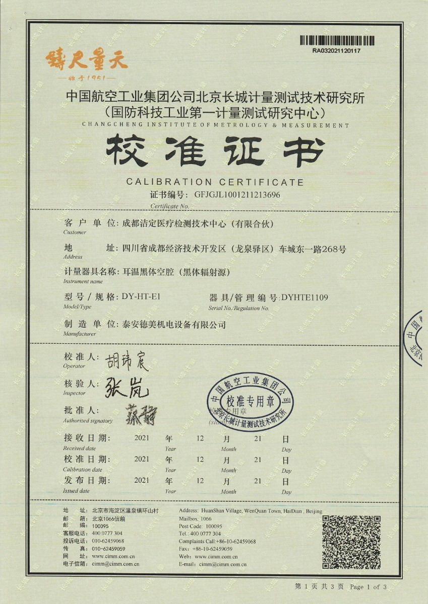 | 上一條:成都潔定醫(yī)療檢測技術(shù)-額溫黑體空腔 | 下一條:高精度制冷恒溫槽(-80~100℃)校準(zhǔn)證書 |