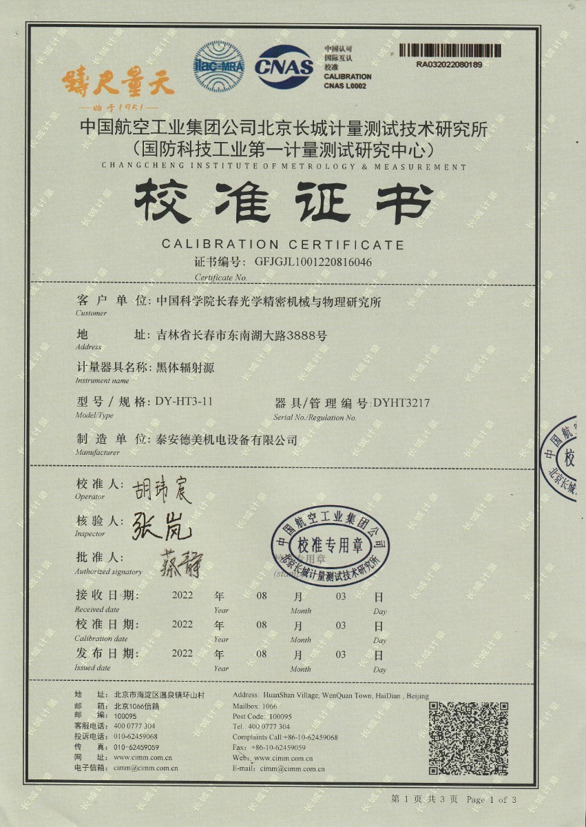 | 上一條:中國科學(xué)院長春光學(xué)精密機(jī)械與物理研究所-黑體爐DY-HT3-2 | 下一條:高精度制冷恒溫槽(-80~100℃)校準(zhǔn)證書 |