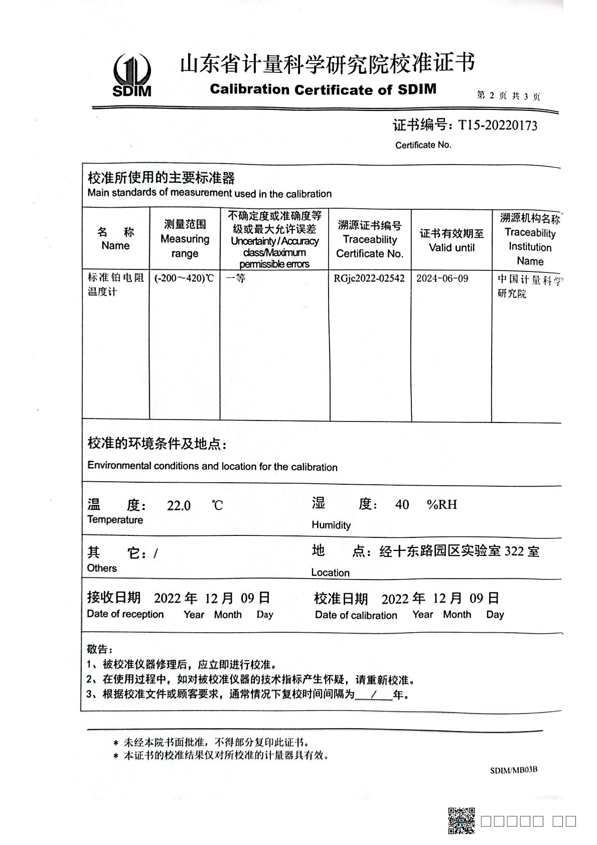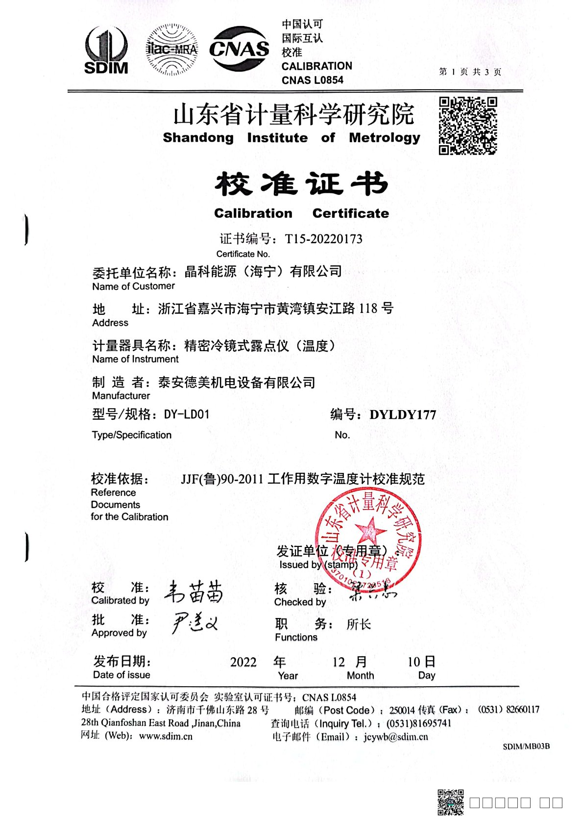 | 上一條:晶科能源(海寧)有限公司 精密冷鏡式露點(diǎn)儀 檢定證書 | 下一條:高精度制冷恒溫槽(-80~100℃)校準(zhǔn)證書 |