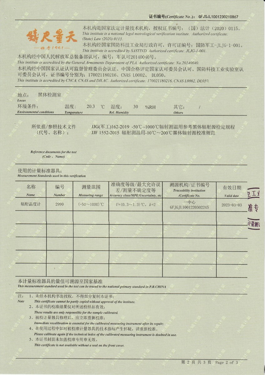 | 上一條:江蘇省產(chǎn)品質(zhì)量監(jiān)督檢驗(yàn)研究院 黑體輻射源 校準(zhǔn)證書 | 下一條:高精度制冷恒溫槽(-80~100℃)校準(zhǔn)證書 |