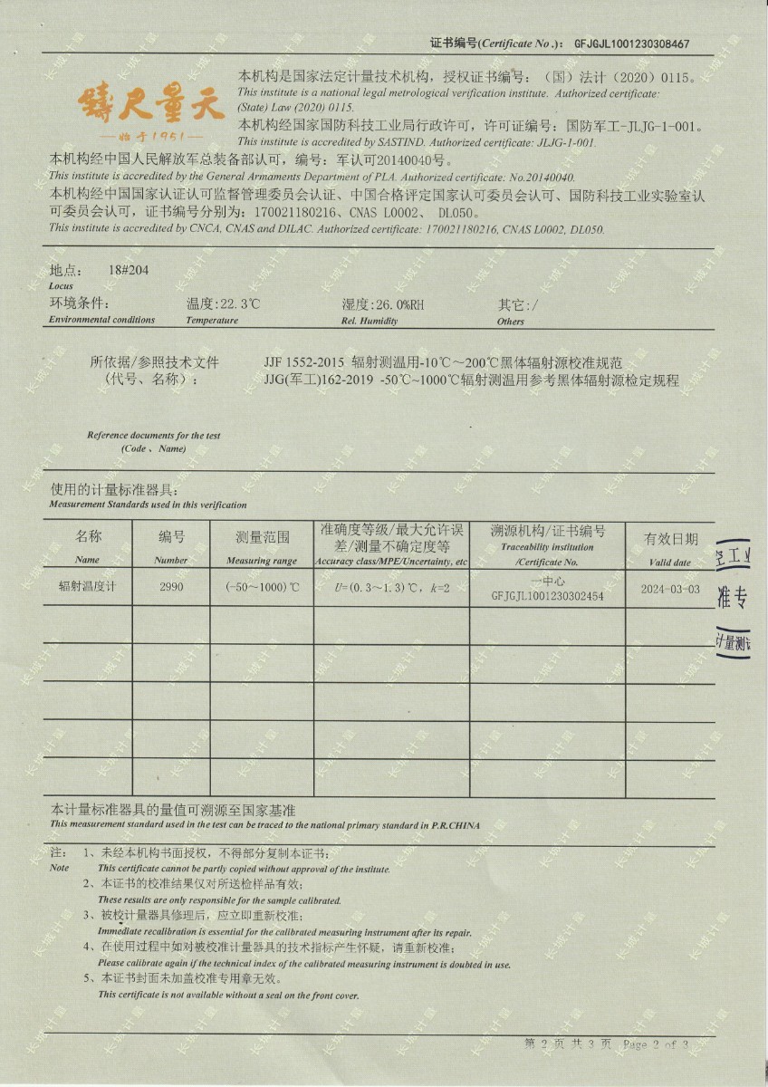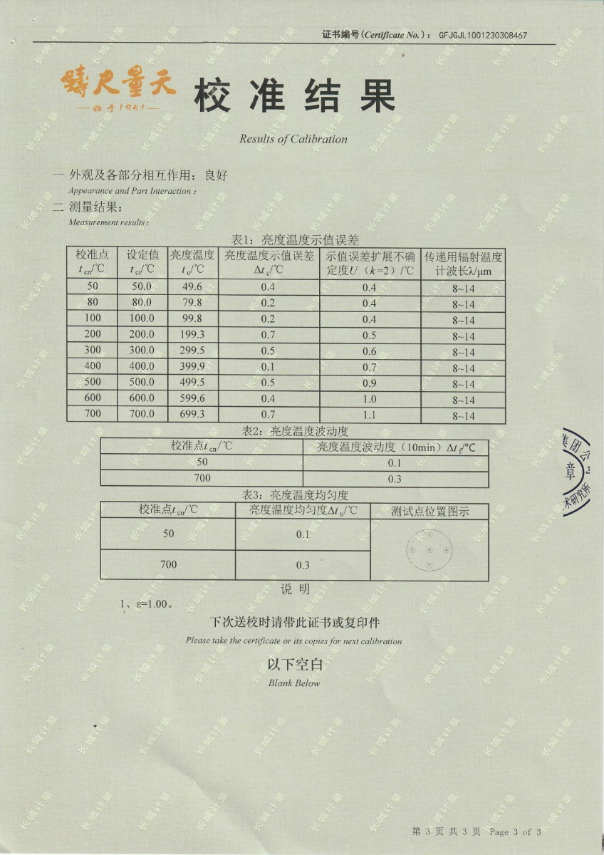 湖南長量檢測股份有限公司 黑體爐 校準證書 2023-3-31 本文被閱讀 12281 次