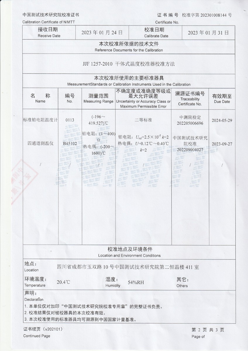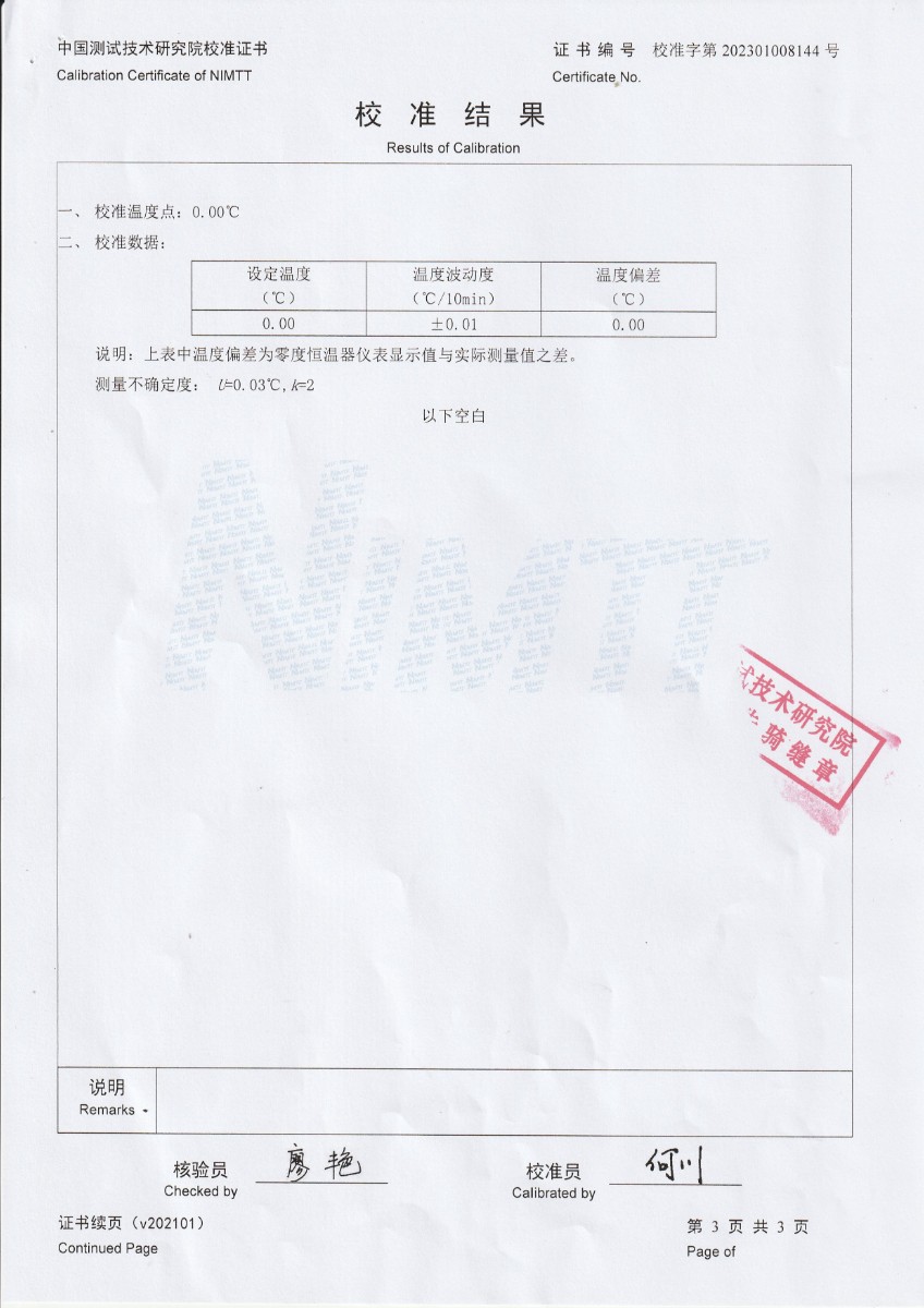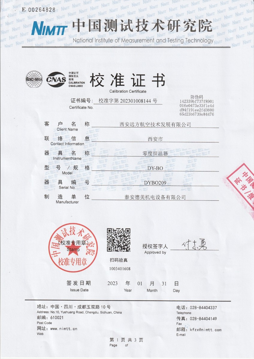 | 上一條:甘肅東興嘉寧新材料有限公司 干體溫度校驗(yàn)爐 校準(zhǔn)證書 | 下一條:高精度制冷恒溫槽(-80~100℃)校準(zhǔn)證書 |