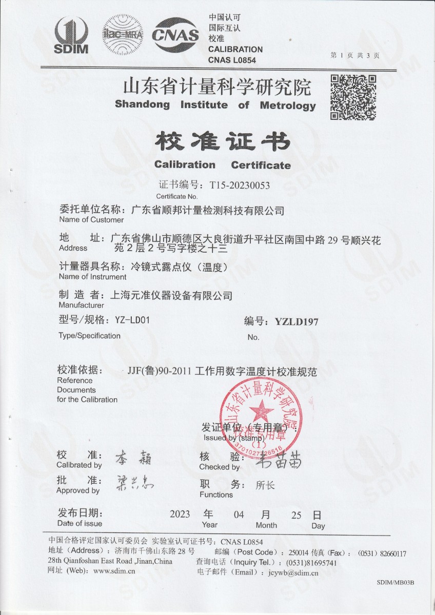 | 上一條:廣東省順邦計(jì)量檢測(cè)科技有限公司 冷鏡式露點(diǎn)儀 檢定證書(shū) | 下一條:高精度制冷恒溫槽(-80~100℃)校準(zhǔn)證書(shū) |