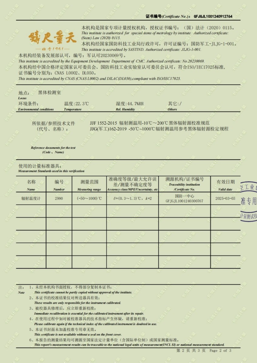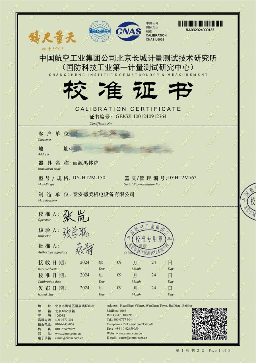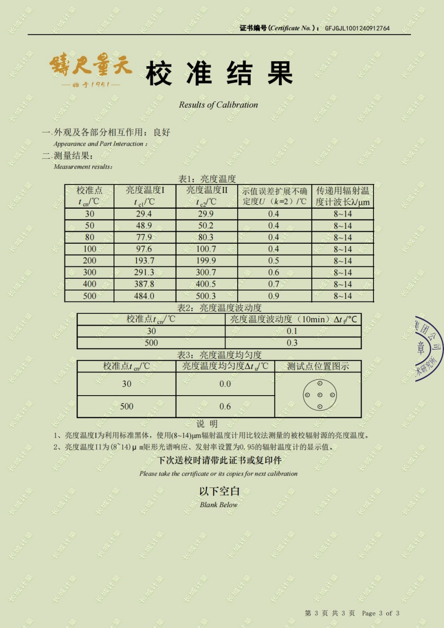 面源黑體爐(室溫+5-500℃)校準證書 2024-10-17 本文被閱讀 6415 次