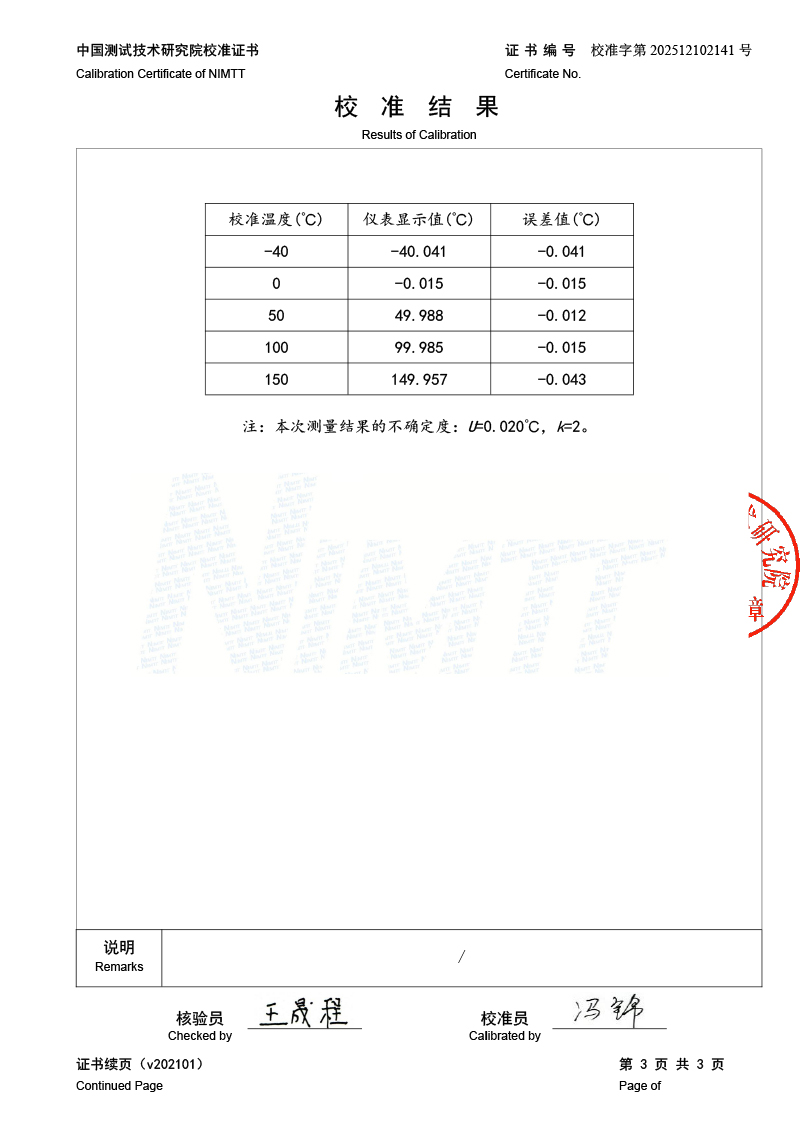 高精度數(shù)字溫度計校準證書