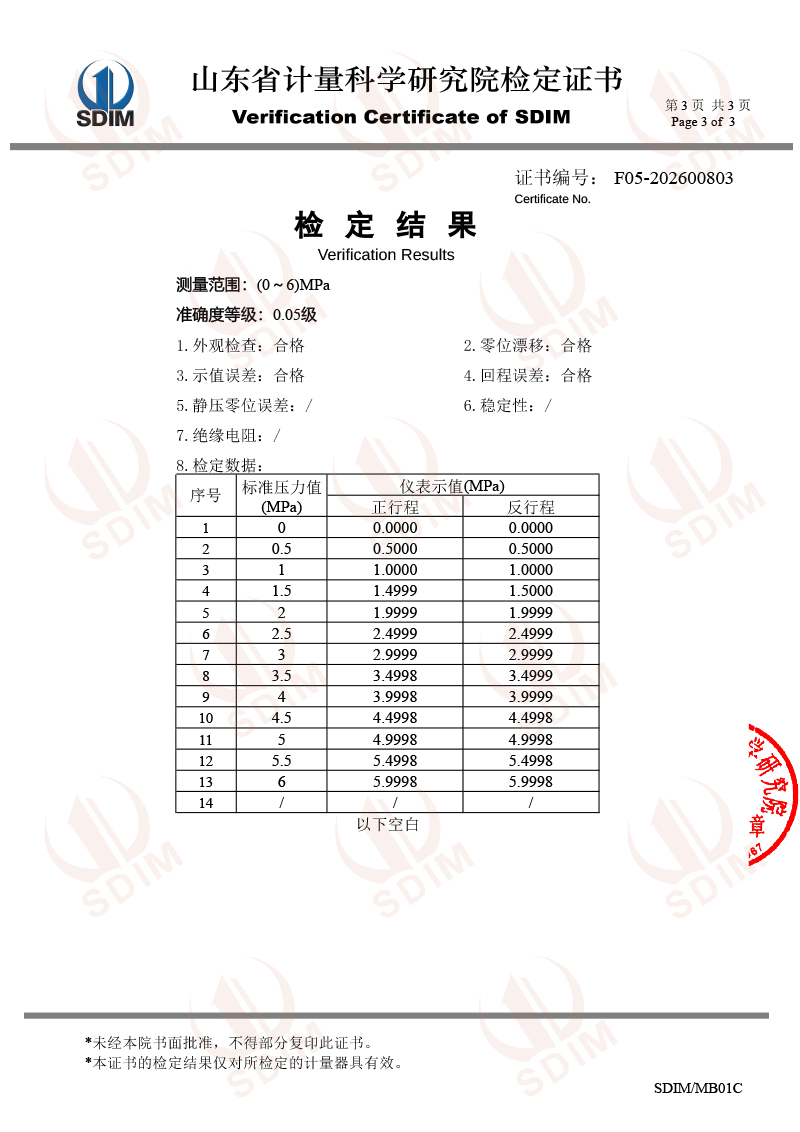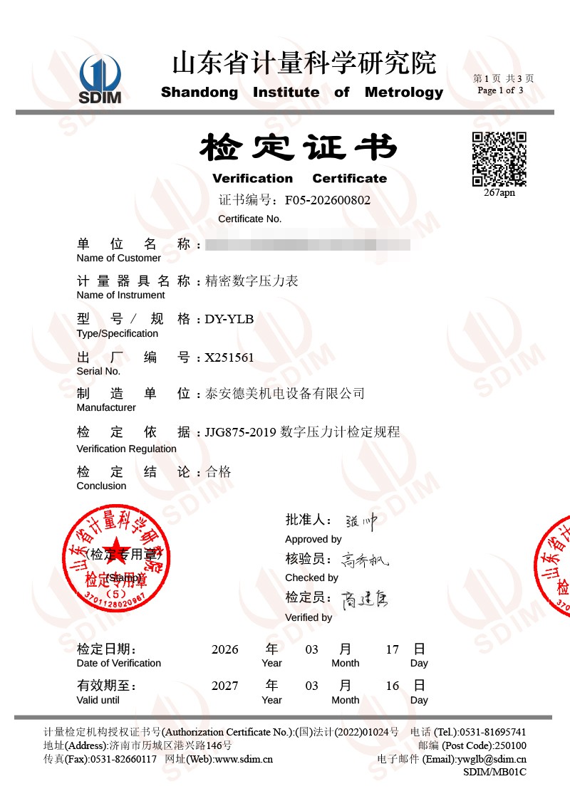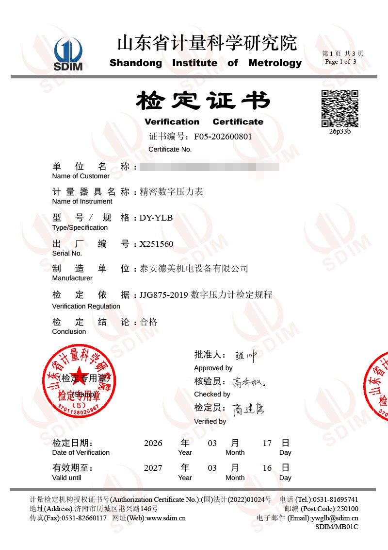 數(shù)字壓力表-校準(zhǔn)證書