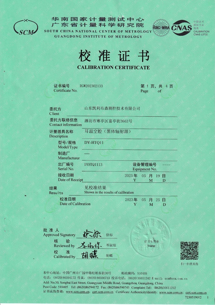 山東凱利布森測控技術(shù)有限公司 耳溫空腔(黑體輻射源) 校準證書 2023-6-3 本文被閱讀 13466 次