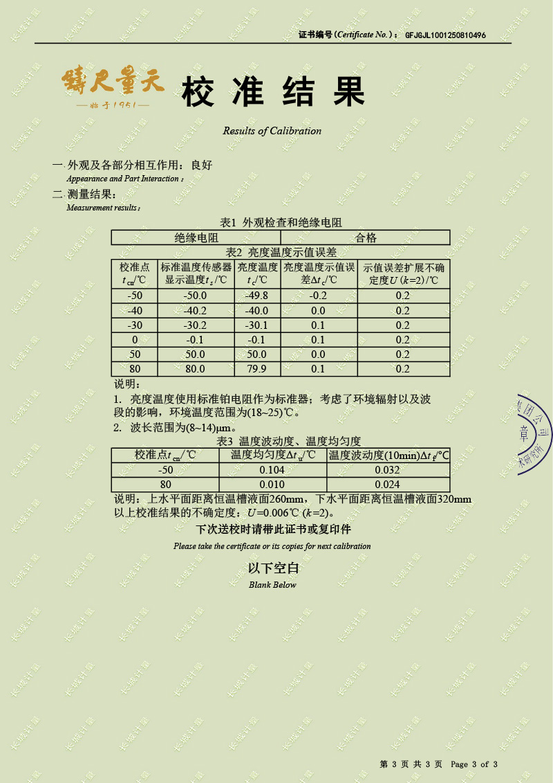 | 上一條:DY-HT1MF-200低溫雙面黑體爐/黑體輻射源(-10℃-80℃) | 下一條:高精度制冷恒溫槽(-80~100℃)校準(zhǔn)證書 |