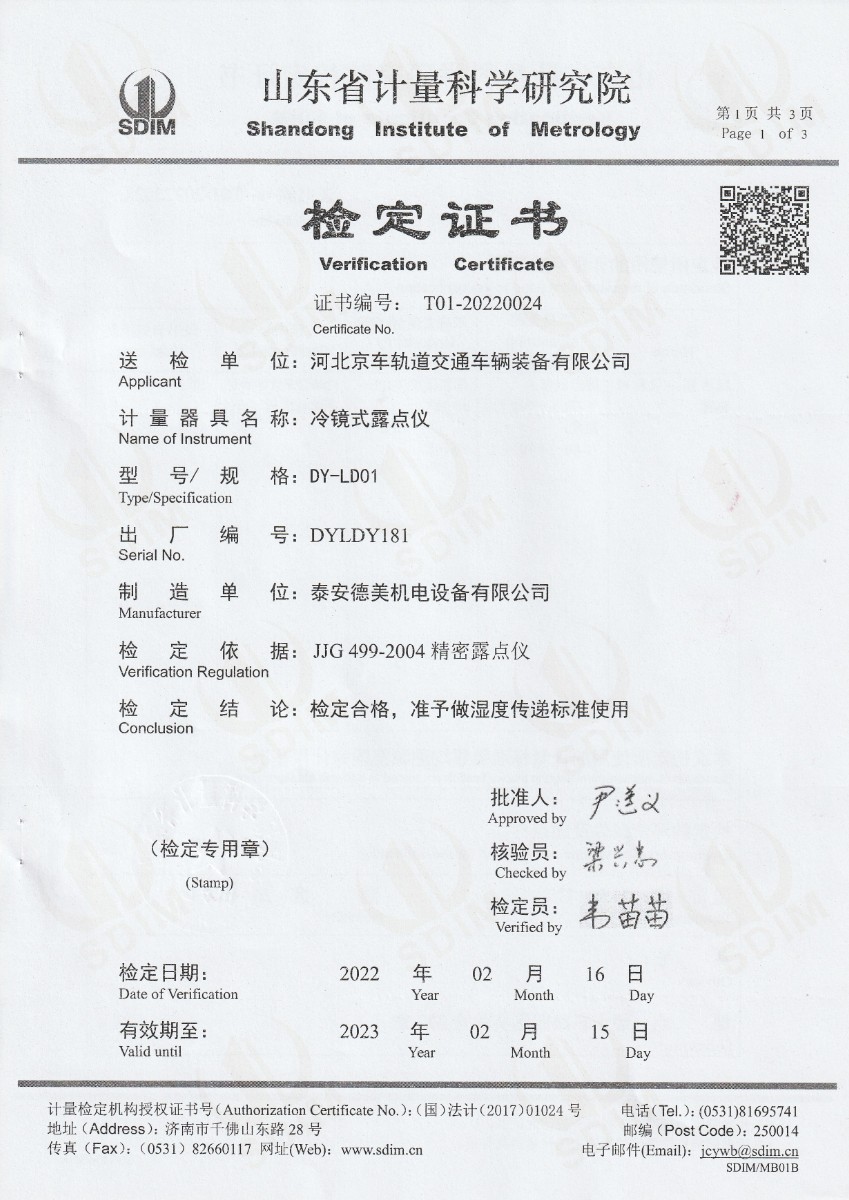 | 上一條:河北京車軌道交通車輛裝備有限公司-冷鏡式露點儀(溫度)校準證書 | 下一條:DY-HT2M-C高溫面源黑體爐(100mm) |
