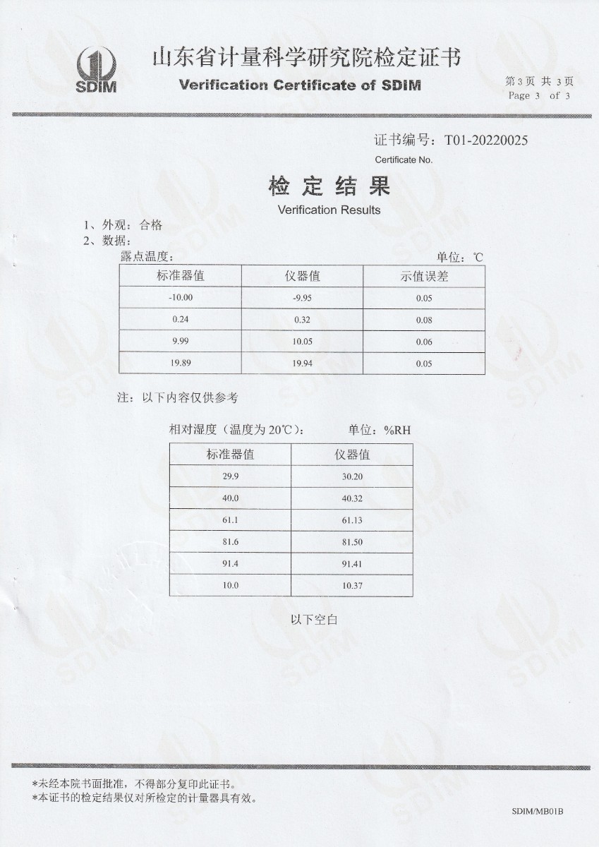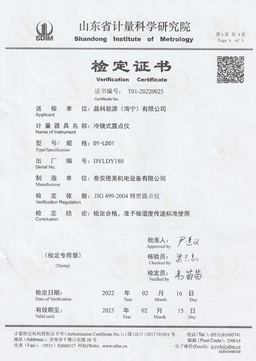 晶科能源(海寧)有限公司-冷鏡式露點儀檢定證書 2022-2-23 本文被閱讀 14394 次