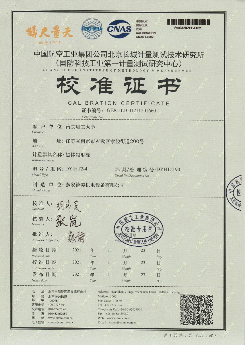 | 上一條:南京理工大學(xué)-黑體輻射源校準(zhǔn)證書180-500℃ | 下一條:濕度發(fā)生器-校準(zhǔn)證書 |