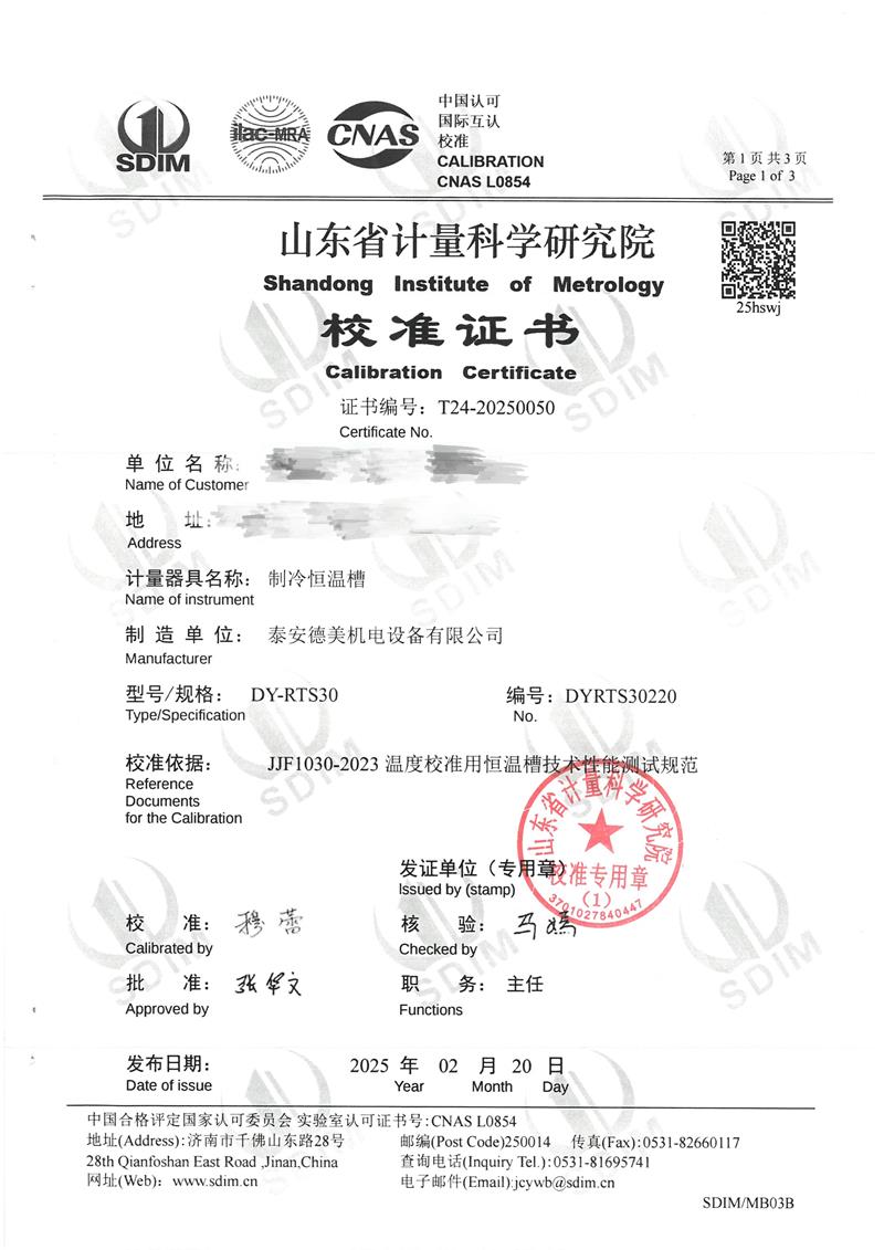 制冷恒溫槽(-30~95℃)校準(zhǔn)證書 2025-2-26 本文被閱讀 5787 次