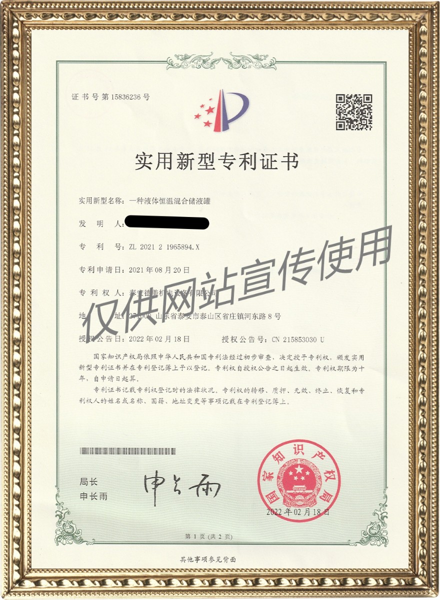 一種液體恒溫混合儲液罐——實(shí)用新型專利證書